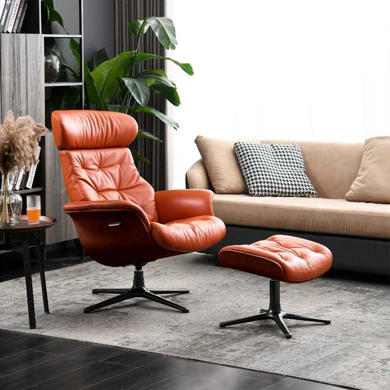 イームズスタイルの北欧デザイン!オレンジ色の本革を使用したラグジュアリーなリクライニングチェア。モダンなリビングにぴったりの休憩用椅子で、心地よい午後のひとときをお届けします。